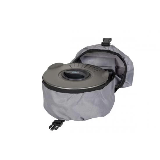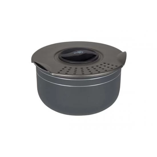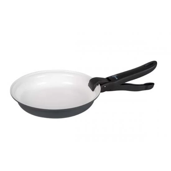 A stylish and very compact 5-piece pan set. This complete lightweight set consists of 2 cooking pans, 1 frying pan, a draining lid and a pan handle. These pans have a powder coating on the outside and a ceramic coating on the inside. Ceramic is very durable and has a high non-stick coating. Can be used on gas, ceramic and electric heat sources. All parts can be stored very compactly in the included luxury protective cover.