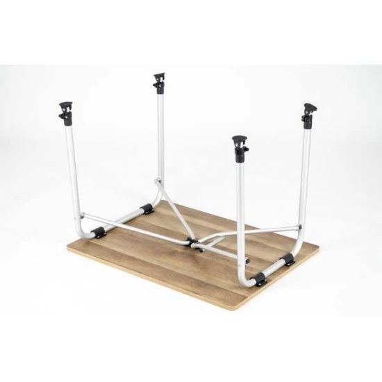 A lightweight but very stable camping table. The table has a fiberglass top with plastic edge which is heat resistant and waterproof. The frame is made of aluminum and the camping table is equipped with feet with stabilizers so that the table stands firmly on any surface. The legs are also adjustable in height (stepless).