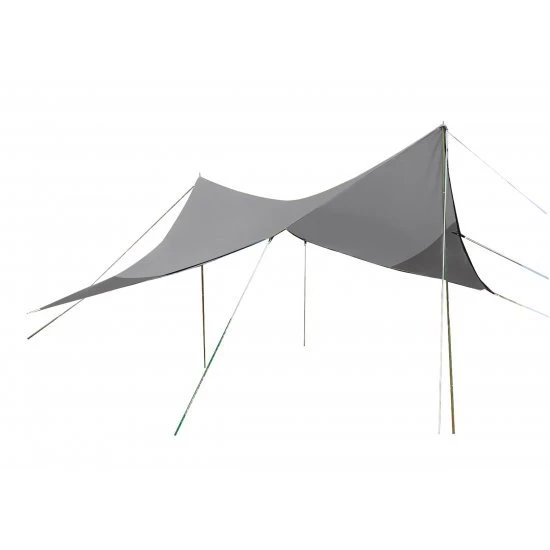 A quadrangular tarp. To be used in the shape of a diamond or in the shape of a square. Creates a roof and shade area quickly and easily. This tarp is waterproof due to the 190T polyester fabric with PU coating and a water column of 2000 mm. Easy to hang at the desired location with the supplied guy ropes and pegs. Includes handy carrying bag (excluding tarp poles).
