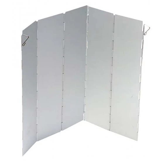 A fully collapsible universal cooking windshield. This cooking windshield can be used in combination with a camping stove or a gas burner. This 5-piece cooking windscreen is placed around the burners or around the burner. This prevents the flame from blowing out and the heat from the flame is transferred to the pan more effectively. After use, the windshield can be easily and compactly stored.