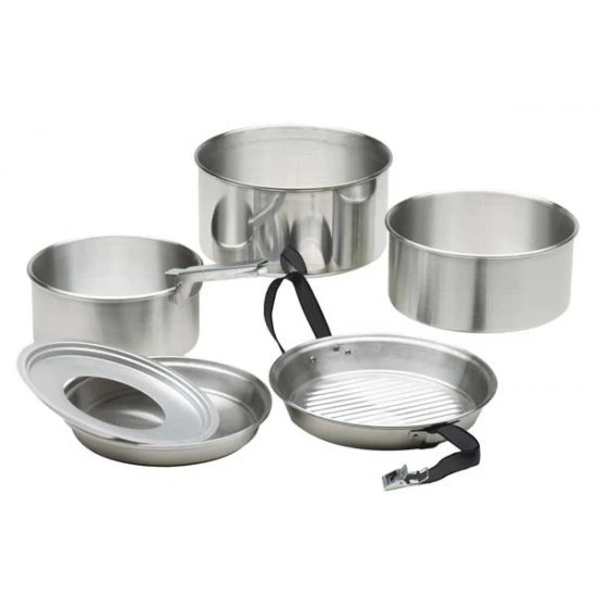 A 7 piece lightweight cooking set. This set consists of 3 cooking pans, 2 frying pans, a stacking ring and a pan handle. Made of sturdy and lightweight aluminum. These aluminum pans can be used on gas, ceramic and electric heat sources. This set is fully nestable and can be tied using the supplied strap.