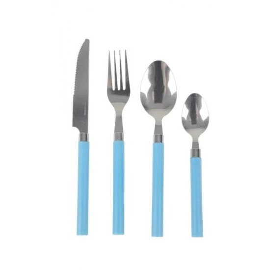 A 4-piece cutlery set. The ideal 1-person cutlery set to take with you on a trip. This set consists of a knife, fork, spoon and a teaspoon.