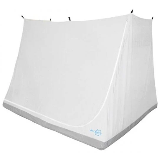 Universal sleeping cabin for the extension of an awning. Quickly creates an extra sleeping place for 2 people and is easy to attach to the frame of the tent. This inner tent is made of breathable polyester with a waterproof groundsheet. In addition, the tent is equipped with ventilation mesh.