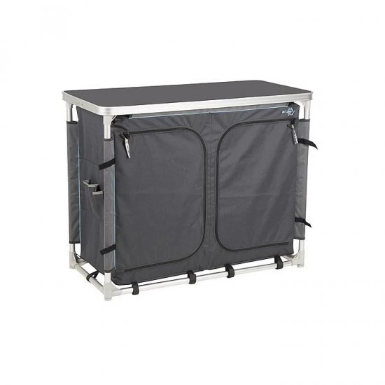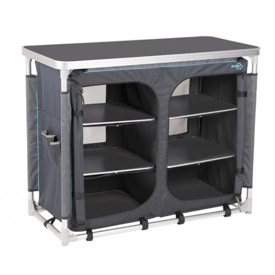 An extra wide and luxurious cooking island. Equipped with an extra sturdy 600 denier polyester cover with 6 handy shelves. The top of this cooking island is heat-resistant, waterproof and suitable for a 4-burner gas stove. The adjustable legs can be adjusted separately so that the cupboard stands stable on any surface. Comes in a carrying case. Folded (lxwxh): 49.5x104x11.5 centimeters.