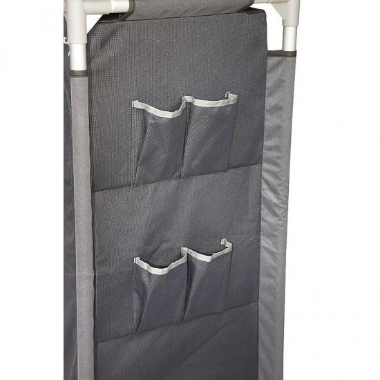 A luxurious and extra high wardrobe. This stable cabinet has 4 sturdy shelves and 2 side compartments. Provided with a luxurious 2-tone 600 denier polyester cover and an extension leaf. The adjustable legs can be adjusted separately so that the cupboard stands stable on any surface. Comes in a carrying case.
