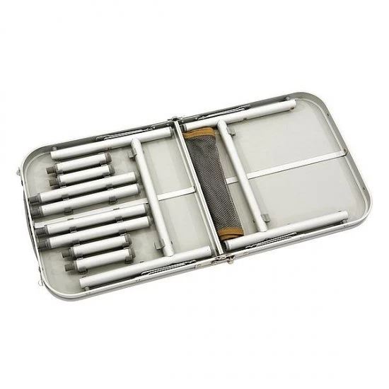A very stable camping table. This table has removable legs and a divisible table top. This makes it easy to fold the table into a suitcase model. Made of lightweight aluminum. The legs are adjustable in 4 different heights (30/44/54/68 cm) and have adjustment screws for fine adjustment. A net is attached under the table top to store things. Folded (lxwxh): 40x40x7 centimeters.