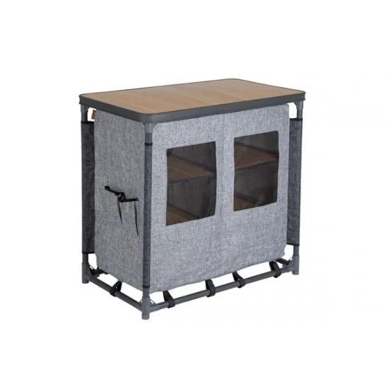 A stylish and luxurious kitchen island. Equipped with an extra sturdy and luxurious 600 denier Oxford polyester with linen look cover with 6 handy shelves and 4 side pockets. Equipped with an MDF top with a wood look. The adjustable legs can be adjusted separately so that the cupboard stands stable on any surface. Comes in a carrying case.