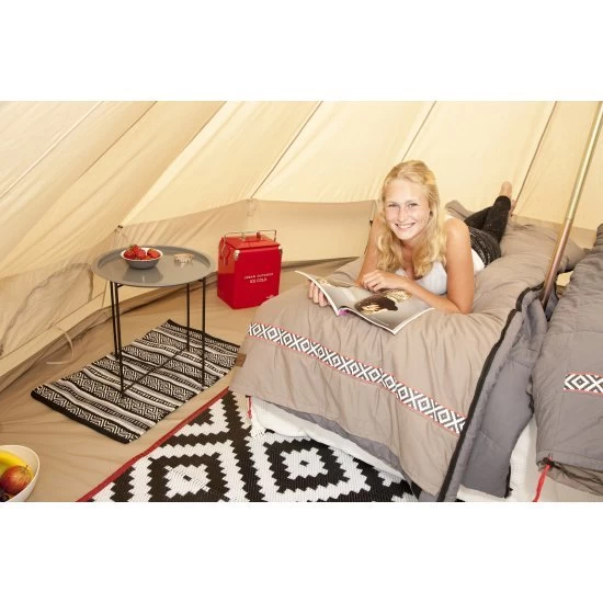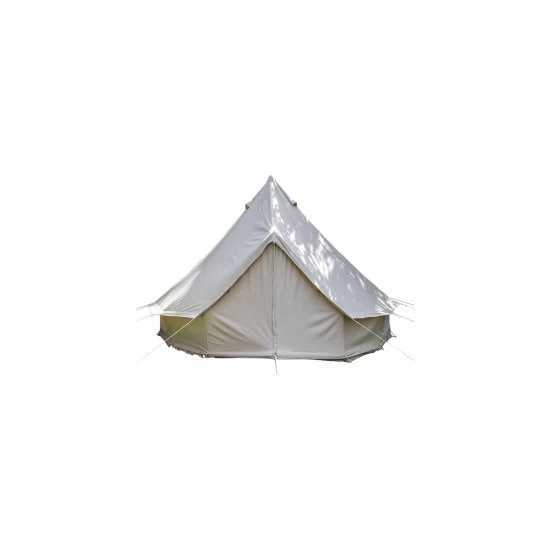 A classic Bell tent. A very popular Sahara tent with a spacious floor area and high ease of use. The diameter of this tent is 4 meters and the ridge height is 2.5 meters. This makes the tent suitable for a maximum of 6 people. Made of a high quality tent cloth, of 100% cotton (285g/m²), and a 540 gram PVC groundsheet. Both are water repellent, rot and mold resistant. The groundsheet is completely removable by means of a zipper. In addition, the sides can be rolled up all the way around to a height of 60 cm for extra ventilation. In addition, there are several windows in the sides. The entrance has a double door, 1 cotton door and a mesh door (against insects). Comes with strong pegs, guy ropes and a handy storage bag. In short, a solid and stylish tent that you can enjoy for years!
