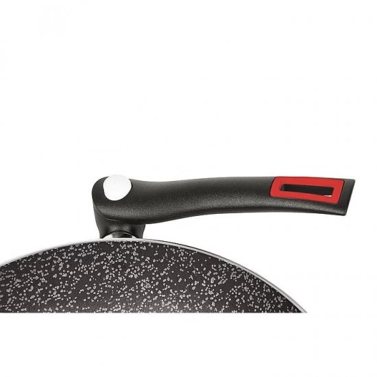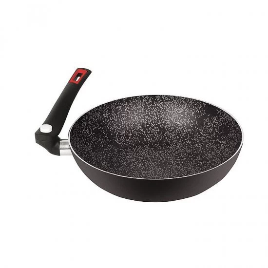 An aluminum wok pan with a high raised edge. This lightweight pan has a 5-layer Salus Stone® coating and a non-slip bottom. The folding handle makes the pan space-saving and easy to carry. Dishwasher safe and suitable for gas, ceramic and electric heat sources. Thickness: 2.5 millimeters.