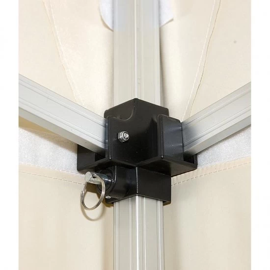 A very stable and foldable party tent. This party tent is very easy to set up and then collapse again. This without having to remove the cloth! In addition, this tent is adjustable in height between 220 and 240 centimeters. Equipped with a sturdy and lightweight aluminum frame and a 300 gr/m² polyester fabric with waterproof coating and taped seams. The party tent can be expanded with various side walls. Dimensions packed (lxwxh): 25x27x159 cm. Dimensions of legs: 29×29 / 24×24 cm. Wall thickness legs: 1.7 mm. Dimensions of the roof frame: 12×25 cm. Wall thickness roof frame: 1 mm.