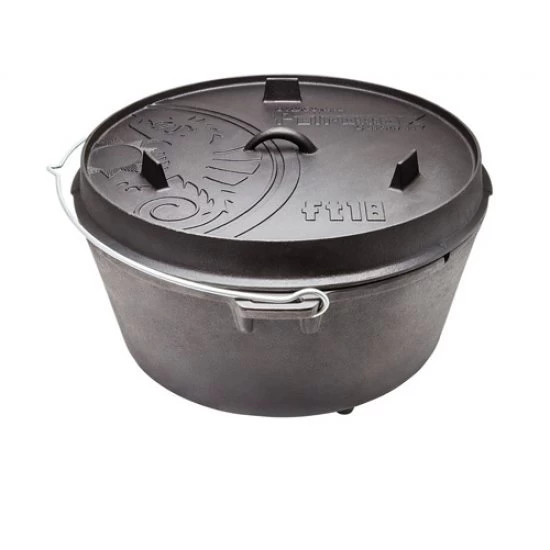 A traditional and multifunctional cast iron pan. This Dutch Oven is ideal for preparing meals over an open fire or over hot coals.