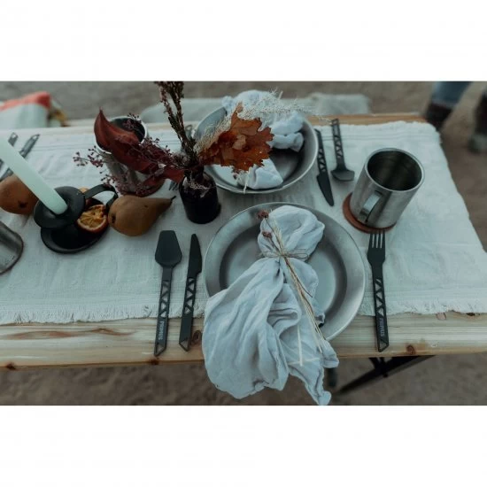 Fork, knife and spoon made of high-quality, hard anodized aluminum. Low weight and excellent durability. A belt keeps the pieces organized.