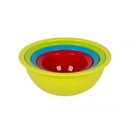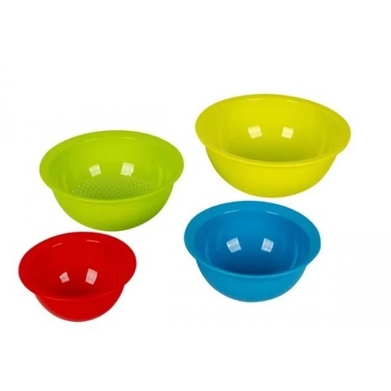 A fully nestable 4-piece bowl set. This colorful bowl set consists of 3 bowls and 1 colander. The bowls and the colander are easy to clean. The bowls fit into each other and are therefore compact and easy to carry.