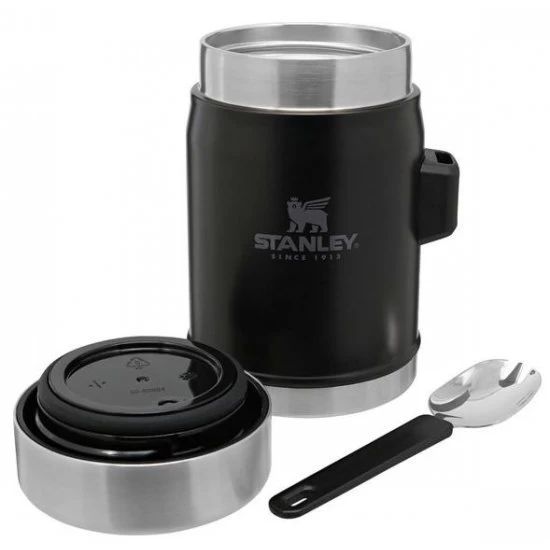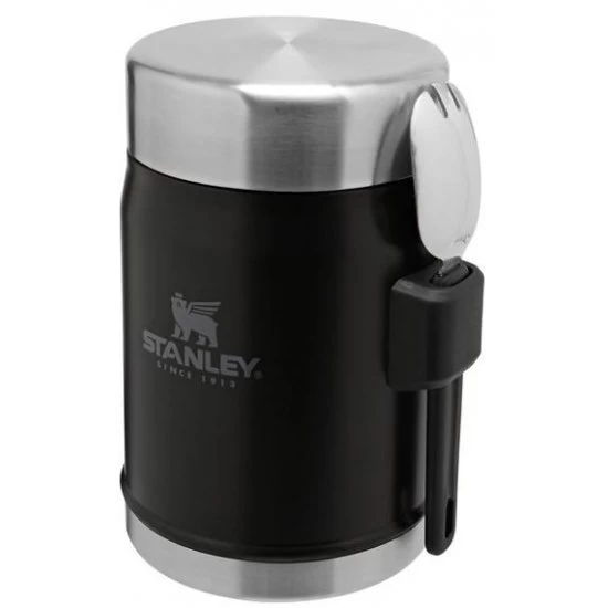 Stanley Classic Legendary Food Jar 0.4L/14 OZ Matte Black with spork. Lunch box keeps hot or cold for 7 hours, lifetime warranty, double wall insulation, leak proof and BPA free.