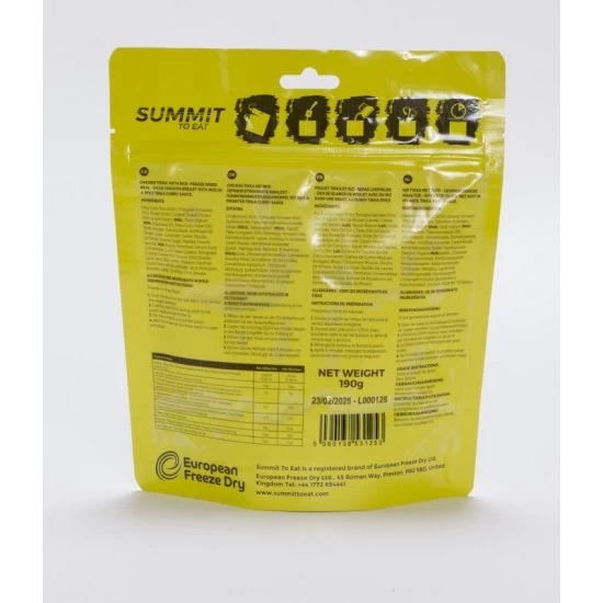 Rice (33%), chopped tomatoes (14%), chopped onion (14%), chicken (13%), whipped cream (milk) (7%), yogurt (milk) (6%), rapeseed oil, Tikka curry paste ( vinegar, tomato paste, sunflower oil, ginger, garlic, coriander, garam masala, ground coriander, sugar, paprika, sea salt, skimmed milk powder, lemon juice concentrate, ground cumin seed, ground fenugreek, ground cardamom, chili powder, lactic acid, bay leaf, thickener (xanthan gum) preservatives ( ascorbic acid, potassium sorbate)), garlic, corn flour, chili powder.