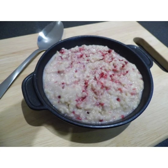 A warm, sweet, creamy oatmeal with delicious raspberry pieces.