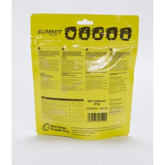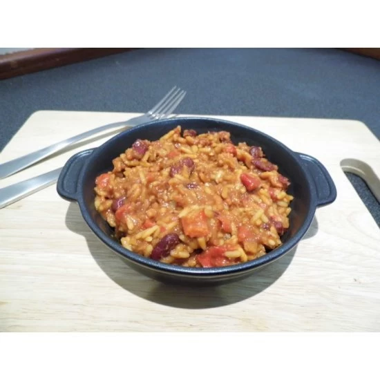 White Rice (23%), Red Kidney Beans (13%), Cauliflower Florets (13%), Diced Peppers (13%), Chopped Tomatoes (13%), Chopped Onion (10%), Tomato Paste, Rapeseed Oil, Dark Chocolate (Sugar, Cocoa Mass, Cocoa Butter, Emulsifier, Vanilla Flavor), Chipotle Chili Paste (Ground Chipotle, Sugar, Vinegar, Salt), Cornflour, Salt.